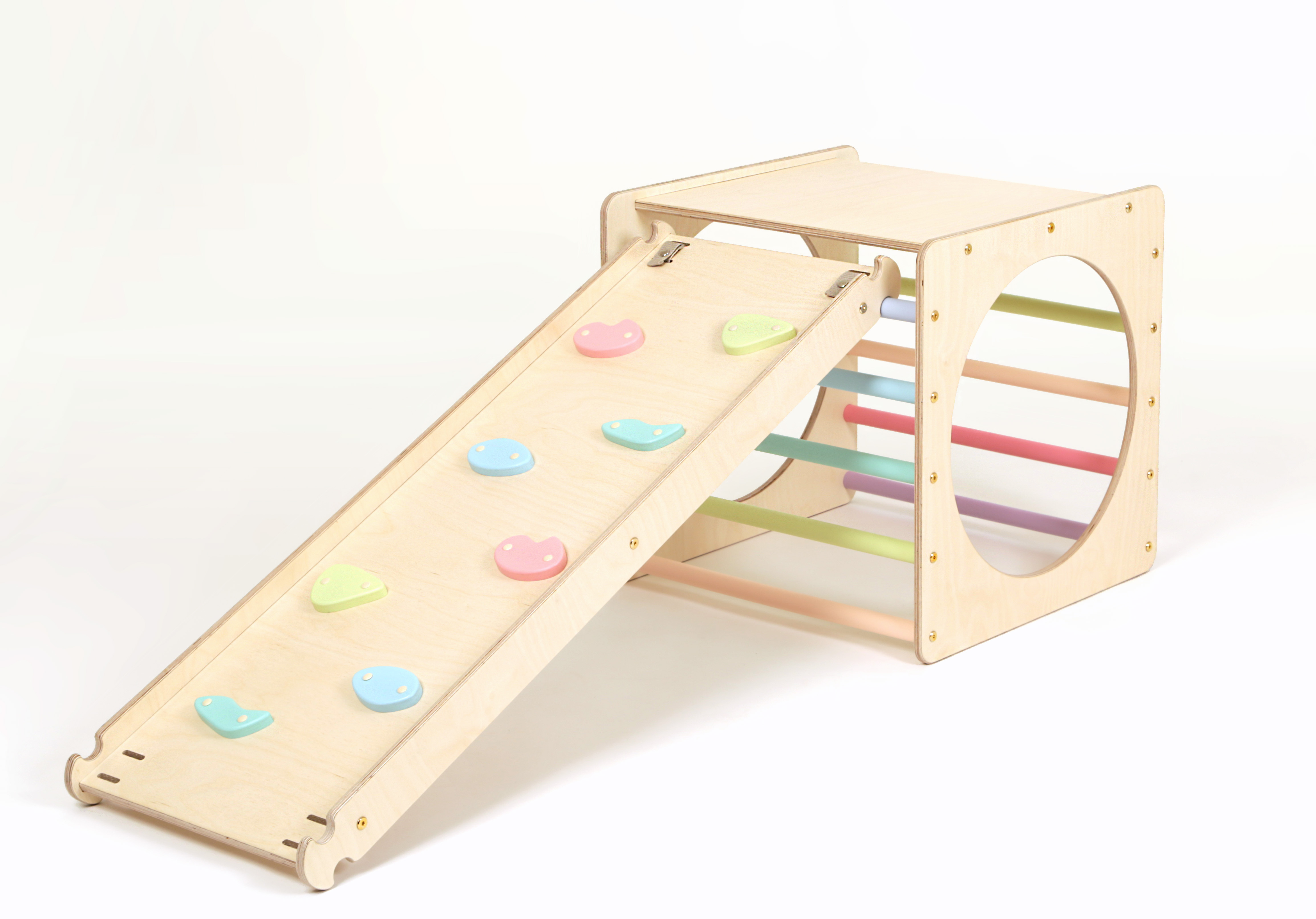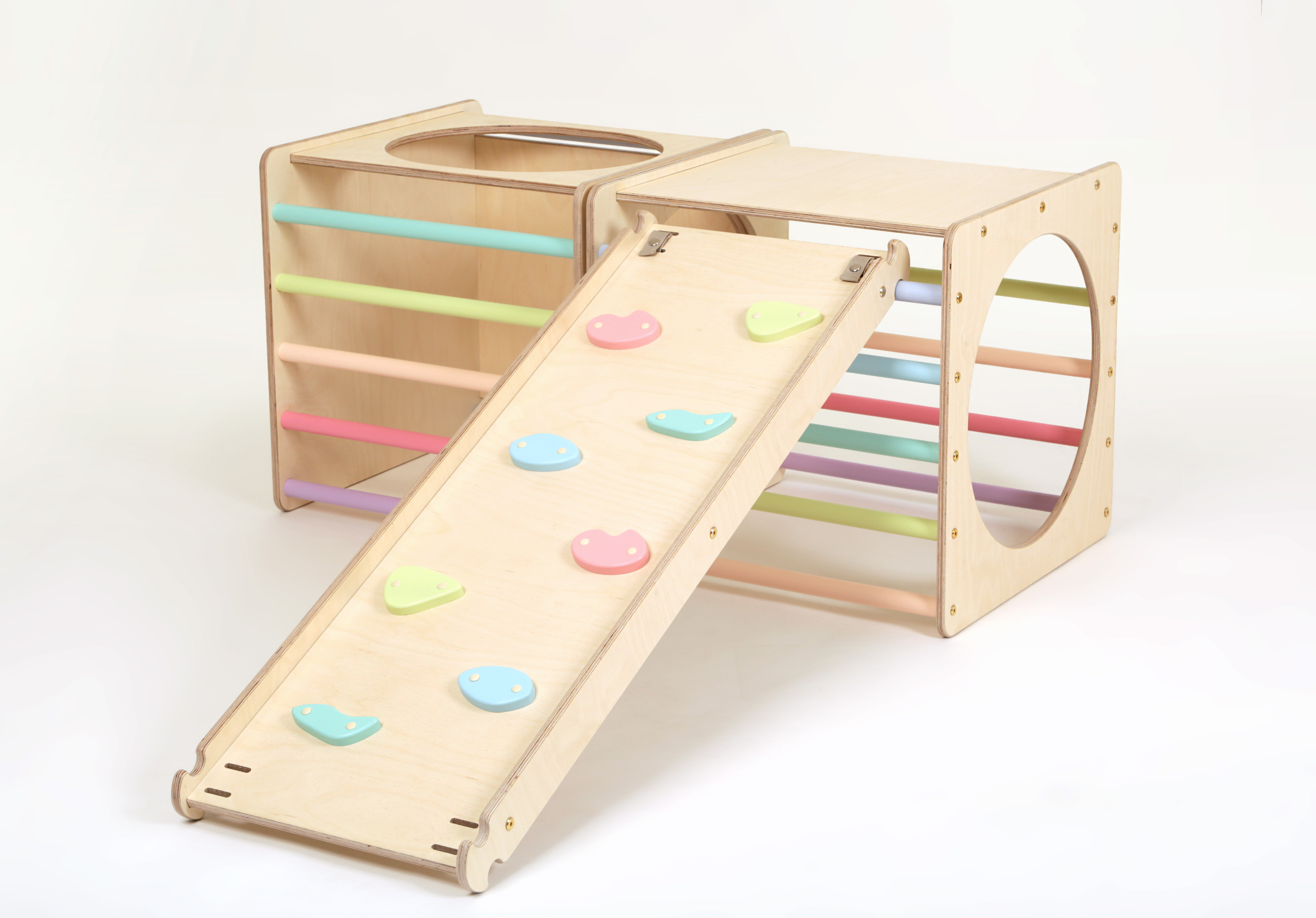 歐洲全手工,僅使用對嬰兒安全且無毒的材料; Baltic birch plywood製成;符合指定國家/地區的安全和質量標準 (EN71, ASTM)。特殊設計的手柄,方便於在邊緣移動和遊玩 。 精心設計,絕對安全。KATEHAA CLIMBING CUBE SET 玩法