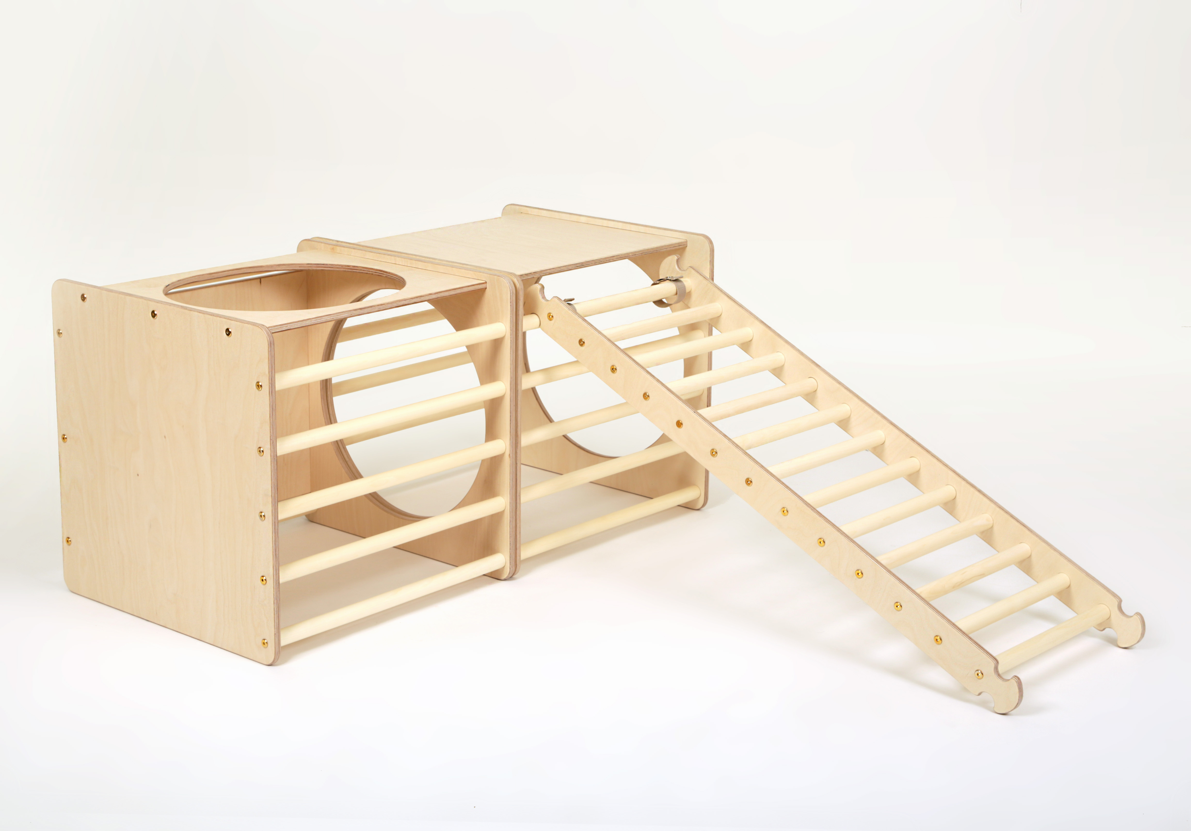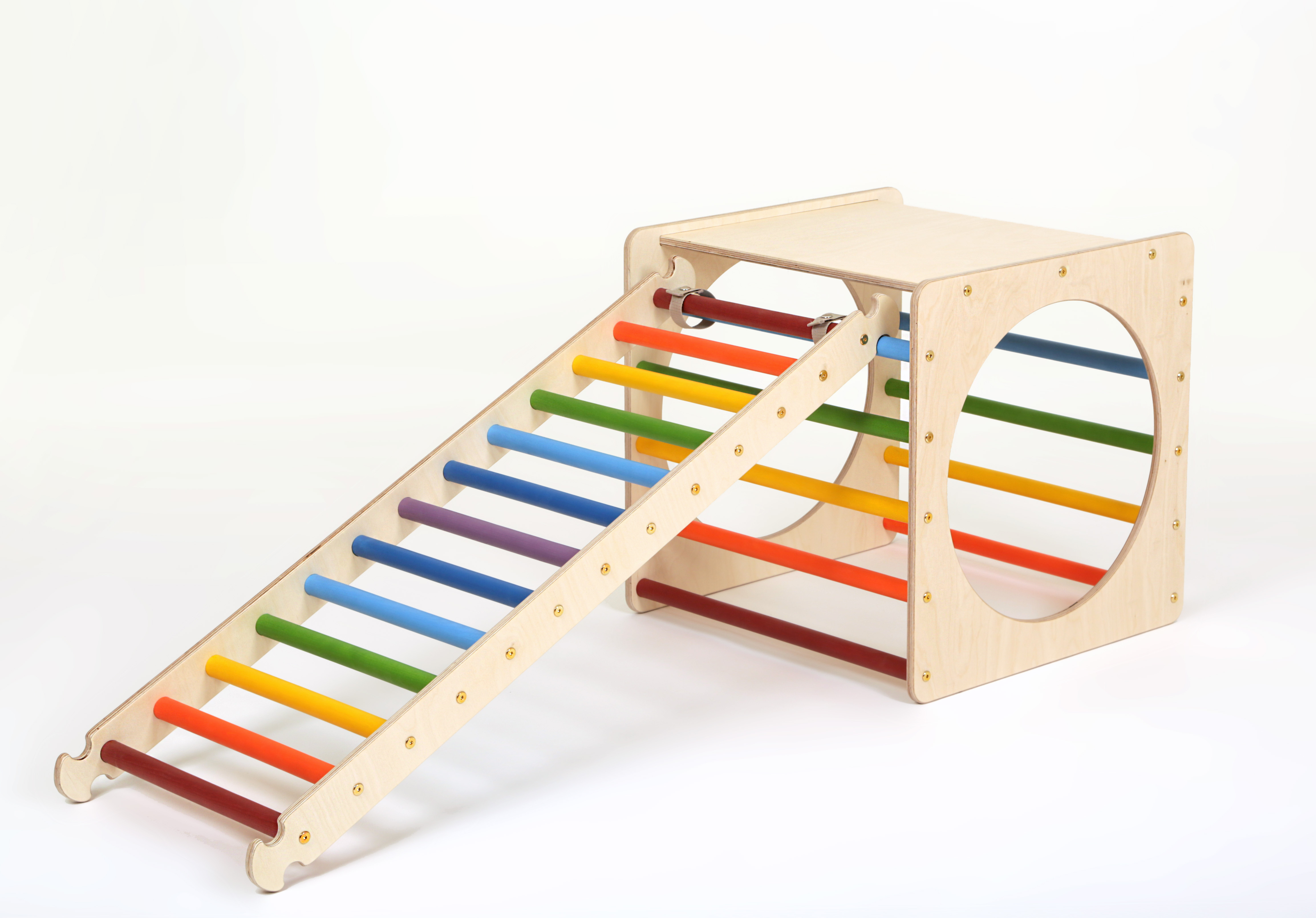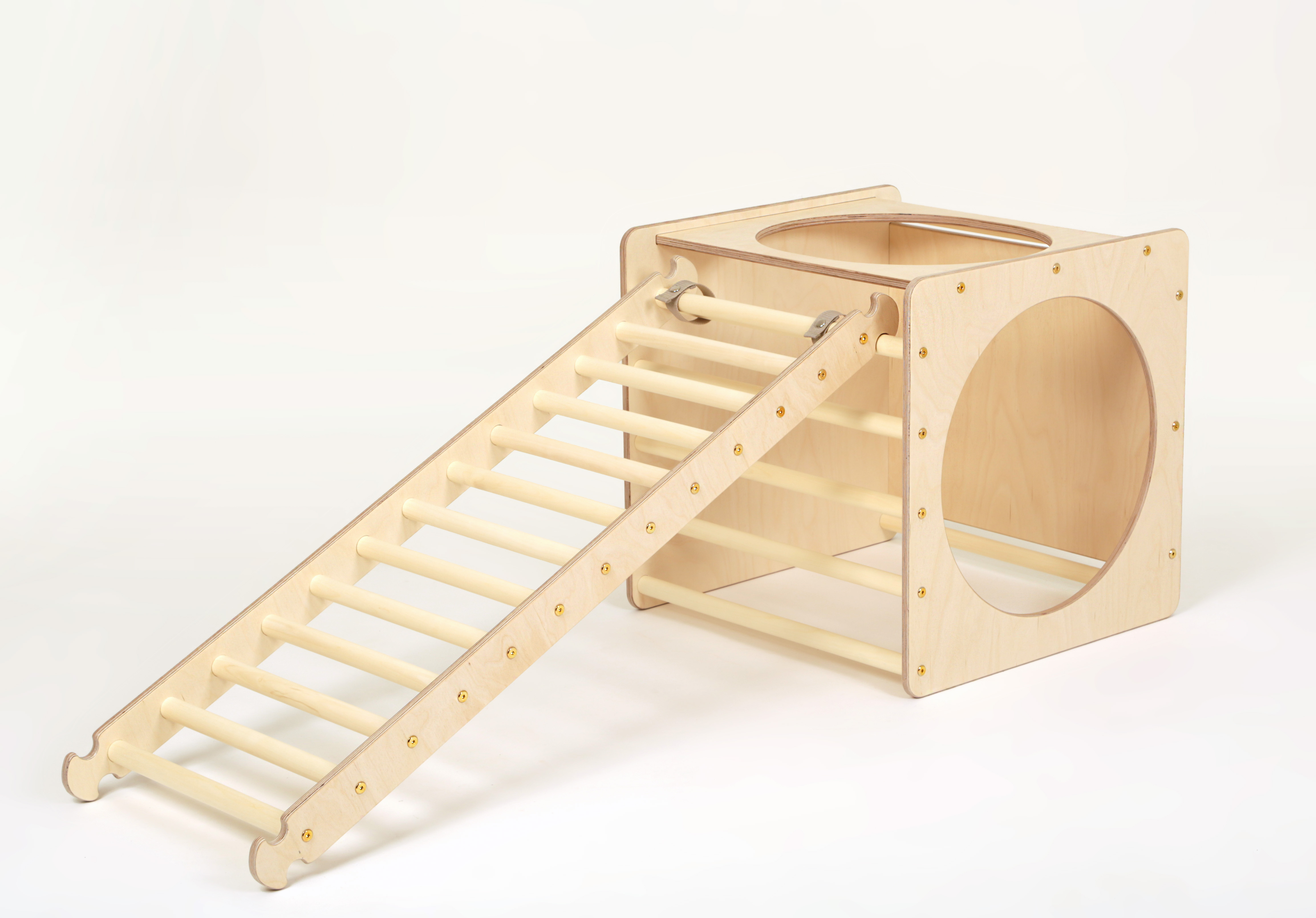 Ladder ramp: ramp sides with natural wood rungs 2.8 cm diameter and 5.7 cm apart.